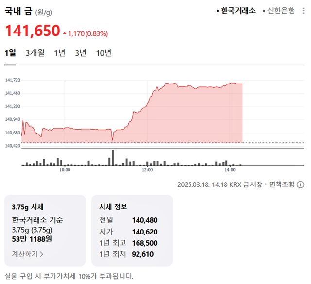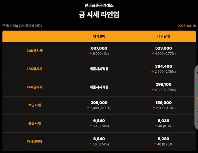 국내 금시세(금값)가 18일(한국 시각) 오후 상승세(전 거래일 대비)를 보이고 있다.