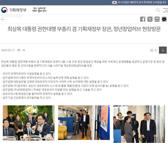 최상목 대통령 권한대행 부총리 겸 기재부 장관은 17일"국유재산을 활용한 청년창업 지원 시설을 지속 확대하겠다"고 말했다.
