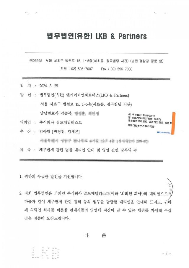 그러면서 “2024년 4월 1일 감사보고서를 통해 2023년 12월 31일부로 해당 채무를 손금 처리한 것을 확인할 수 있다”라며 “2차 내용증명은 단순한 법적 절차 안내였으며, 변제 방법 및 일정에 대해 협의할 의사를 전달한 것뿐”이라고 말했다.