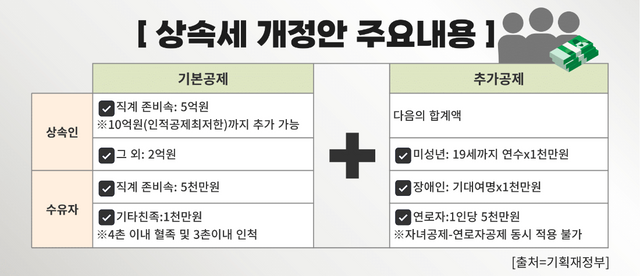 상속세 과세 체계 뿐 아니라 공제 제도도 개편하기로 했다. 기존에는 일괄공제 5억원과 배우자공제 5억원 내지 기초공제 2억원에 자녀 1인당 5000만원 추가공제 했다. 그러나 앞으로는 배우자는 10억원, 자녀는 5억원 등을 각각 일괄공제 한다. 만약 상속재산 20억원을 배우자 1명과 자녀 2명에 상속한다고 가정했을 때 현재는 13억5714만원을 공제한 나머지 6억4286만원에 세율이 부과돼 총 1억2887만원의 세금이 부과됐지만 공제 제도가 개편되면 세금이 제로(0)가 된다.