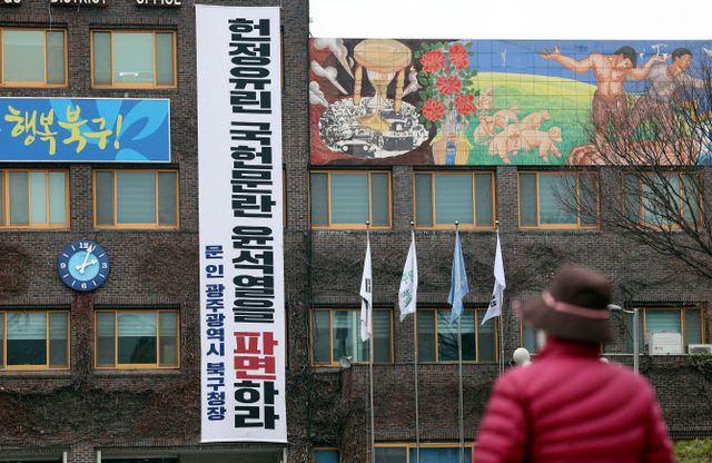 문 구청장은 지난 10일 청사 외벽에 ‘헌정 유린 국헌문란 윤석열을 파면하라’는 가로 2m, 세로 10m 규모의 현수막을 걸었다.