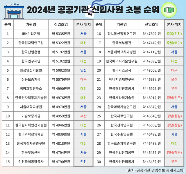 대전광역시에는 순위권 내에 가장 많은 공공기관 본사가 존재했다. 지난해 공공기관 신입 연봉 2위를 기록한 한국원자력연구원을 비롯해 ▲한국연구재단 ▲국방과학연구소 ▲한국원자력통제기술원 ▲한국원자력안전기술원 ▲한국지질자원연구원 ▲한국에너지기술연구원 ▲한국표준과학연구원 등 30위권 내 7개의 기업이 대전광역시에 본사를 두고 있다.