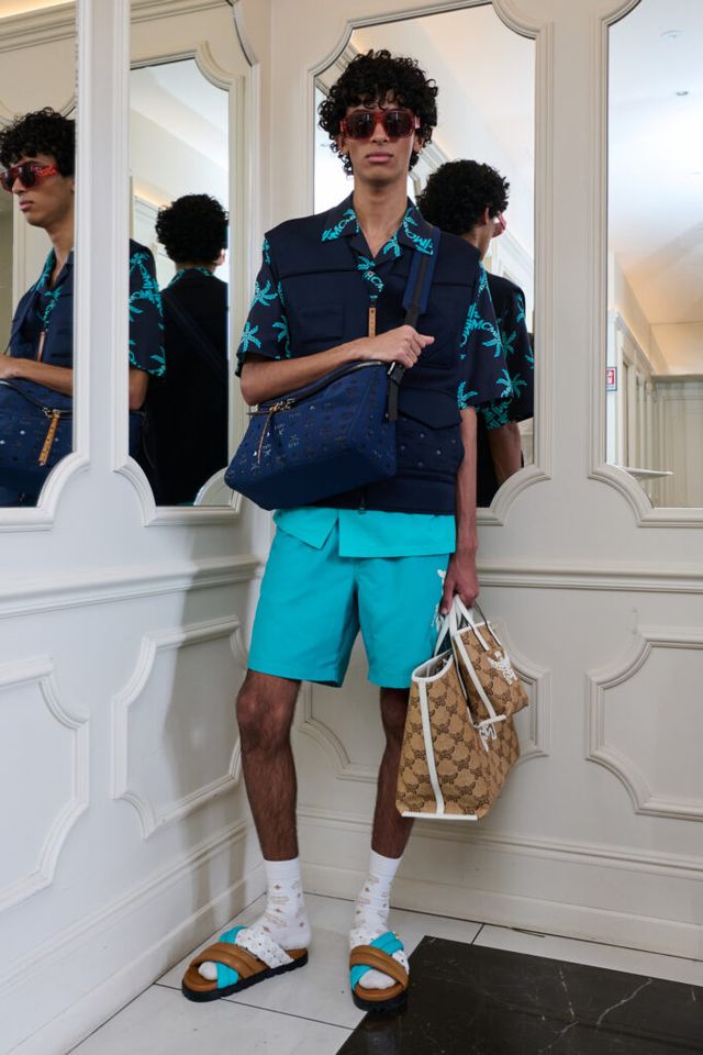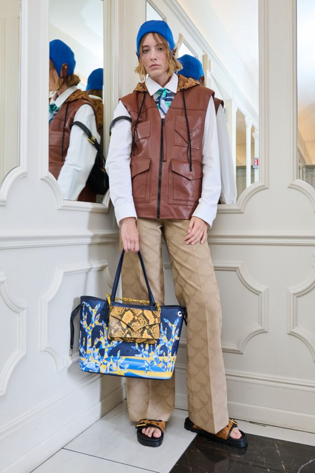 FAVORITE LOOK 구명조끼가 연상되는 레더 베스트와 아이코닉한 로레토스 패턴 팬츠를 매치하고, 2025년 뱀의 해를 기념해 출시한 뱀 가죽 백과 산호초를 그래픽적으로 표현한 백을 더블 백으로 스타일링한 룩