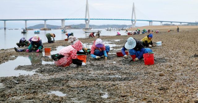 2021년 4월 28일 충남 태안군 고남면 영목항 앞바다에서 주민들이 바지락을 캐고 있다. / 연합뉴스