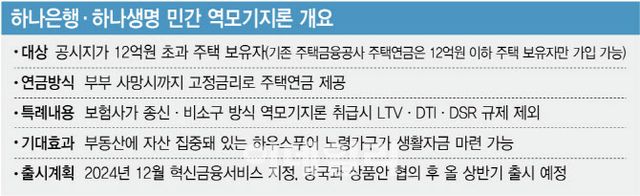 18일 금융권에 따르면 하나은행·하나생명은 올 상반기 출시를 목표로 민간 주택연금 상품과 관련 금융당국과 상품구조·내용을 협의 중이다. 민간 주택연금 서비스는 지난해 12월 금융위원회가 혁신금융 서비스로 지정한 역모기지론이다. 공시지가 12억원이 넘는 주택 보유자도 주택을 담보로 사망 시까지 연금을 받을 수 있다.