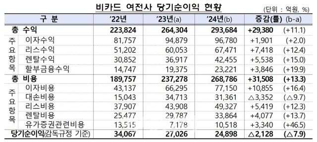 반면, 비카드 여전사의 당기순이익은 2조4898억원으로 전년(2조7026억원) 대비 7.9% 감소했다. 리스·렌탈·할부 수익(1조6802억원 증가) 및 이자 수익(1901억원 증가)이 있었으나, 이자비용(1조855억원 증가)과 유가증권 관련 비용(3340억원 증가)이 크게 늘면서 순이익이 감소했다.