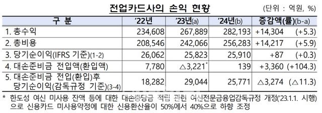 18일 금융감독원이 발표한 자료에 따르면, 지난해 카드사의 당기순이익은 2조5910억원으로 전년(2조5823억원) 대비 87억원(0.3%) 증가했다. 카드대출 수익(4673억원 증가), 할부카드 수수료 수익(2897억원 증가), 가맹점 수수료 수익(670억원 증가) 등이 실적 개선을 견인했다. 그러나 이자 비용(5983억원 증가)과 대손비용(2107억원 증가) 역시 큰 폭으로 늘어나면서 순이익 증가폭은 제한적이었다.