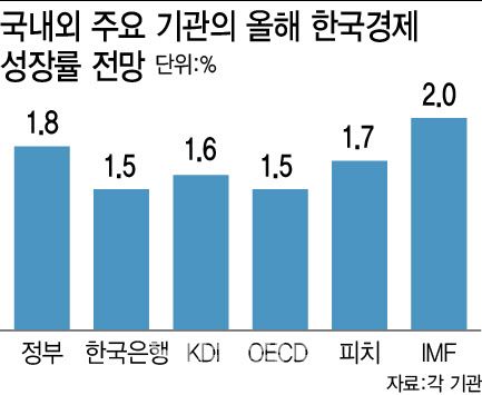 주요 국내외 경제전망 기관들은 이미 1%대로 성장률을 낮췄다. 전날 OECD가 작년 12월 2.1%를 전망했지만 3개월 만에 1.5%로 0.6%포인트 하향 조정했고 이외 정부(1.8%), 한국은행(1.5%), 한국개발연구원(KDI·1.6%), 국제 신용평가사인 피치(1.7%) 등도 조정을 끝낸 상태다.