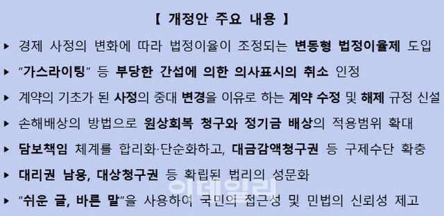 개정안 중 일반 국민에게 가장 와닿을 부분으로 김 교수는 ‘변동형 법정이율제 도입’을 꼽았다. 현행 민법에서는 법정이율을 연 5%로 고정해 놓았는데, 경제 상황 변화로 인해 오히려 불합리한 결과를 낳고 있다는 것이다.
