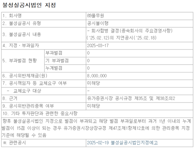2020년에는 풀무원식품이 서울지방국세청으로부터 344억원가량의 추징금을 부과받은 사실을 12일간 공시하지 않아 불성실공시법인 지정 예고 통보를 받았다. 다만 감경에 따른 벌점 미부과로 최종 심의에서 지정이 취소됐다. 이번에 풀무원이 받은 공시위반제재금은 800만원으로, 17일 납부를 마쳤다.