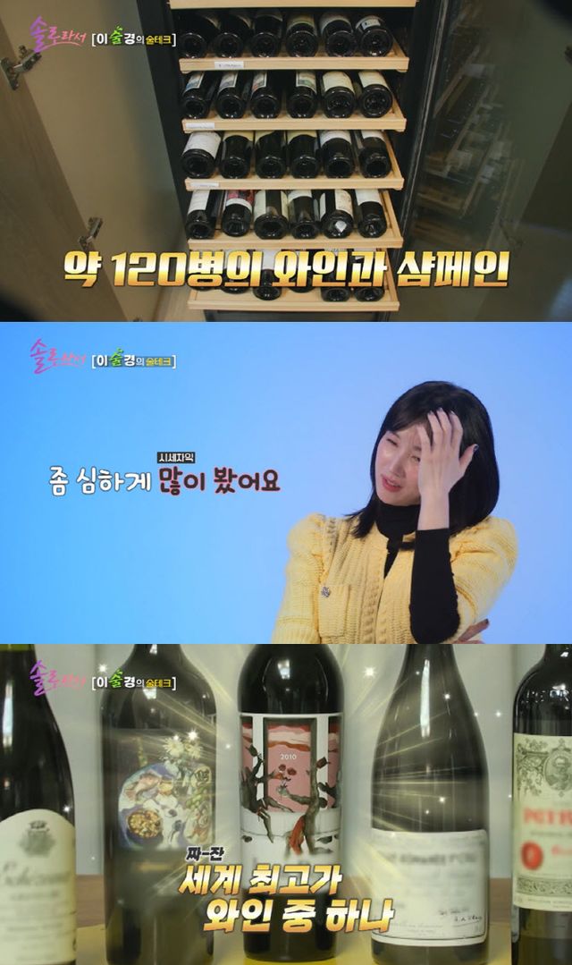 이수경은 술로 가득 찬 냉장고는 물론 와인셀러도 보유하고 있었다. 레드와인, 화이트 와인, 샴페인, 5대 샤또 등의 고급 술까지. 이수경은 “제가 예뻐하는 애들을 위 쪽으로 올리는 것 같다. 보고 싶은 기준은 가격이다”라고 말했다.