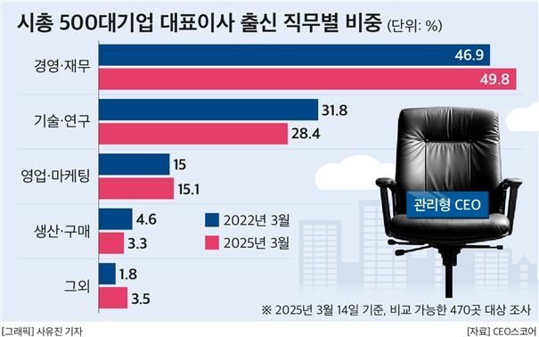 반면 경영·재무 등 이른바 관리형 CEO 비중은 같은 기간 46.9%에서 49.8%로 2.9%p 늘며 전체의 절반에 육박했다.