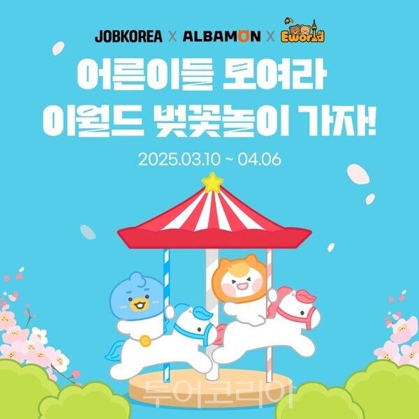 잡코리아와 알바몬이 이랜드가 운영하는 테마파크 이월드와 손잡고 벚꽃 시즌 맞이 이벤트를 내달 6일까지 실시한다.