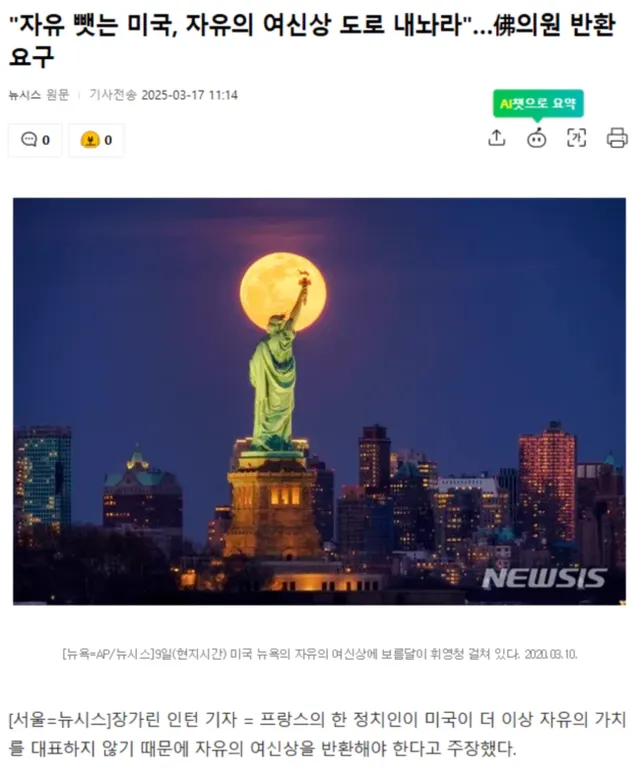 "자유 뺏는 미국, 자유의 여신상 도로 내놔라".. 프랑스 의원 반환 요구