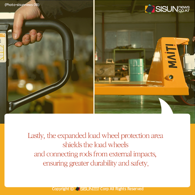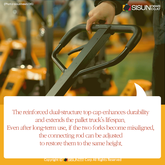 The reinforced dual-structure top cap enhances durability and extends the pallet truck’s lifespan. Even after long-term use, if the two forks become misaligned, the connecting rod can be adjusted to restore them to the same height.