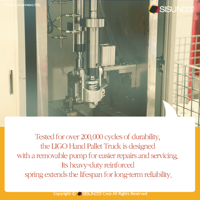 Tested for over 200,000 cycles of durability, the LIGO Hand Pallet Truck is designed with a removable pump for easier repairs and servicing. Its heavy-duty reinforced spring extends the lifespan for long-term reliability.