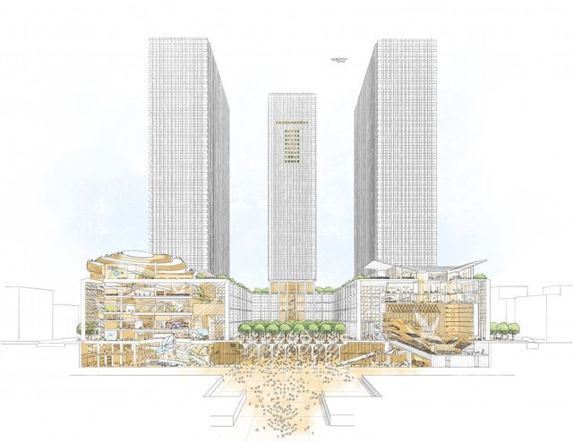 제안서에 따르면 GBC는 242m 높이의 54층 타워 3개 동과 전시장, 공연장 등 저층부 2개 동으로 구성된다. 단지 중앙에는 축구장 2배인 1만4000㎡(약 4235평) 크기의 개방형 도심 숲이 들어선다. 민간이 개발한 복합단지 내 녹지공간 중에선 국내 최대 규모다.