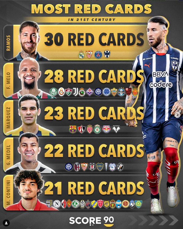 축구 통계 사이트 '스코어 90'에 따르면, 라모스는 퇴장 30회, 269번의 경고로 2위인 플루미넨시의 필리페 멜루(퇴장 28회)보다 2장 더 많은 퇴장 이력을 갖게 됐다.