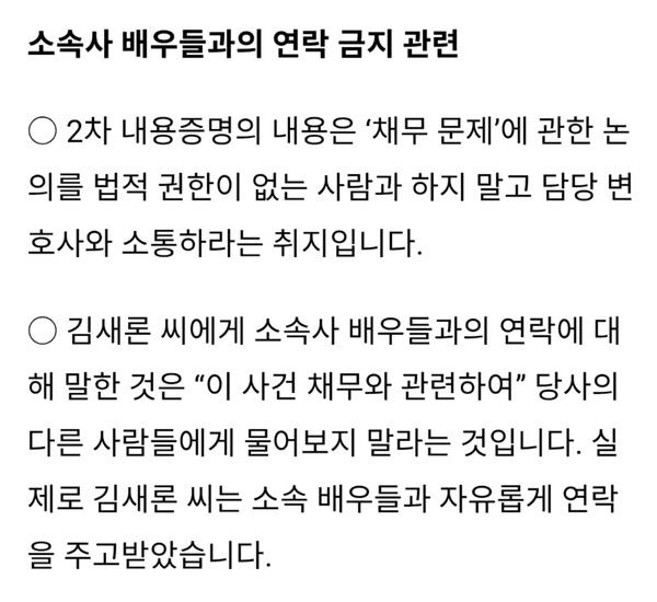 이어 "내용증명 내용에는 채무 문제를 법적 권한이 없는 사람과 논의하지 말고 담당 변호사와 직접 소통하라는 취지가 담겼을 뿐, 김새론씨에게 소속 배우들과의 연락을 금지한 것이 아니다"라고 강조했다.