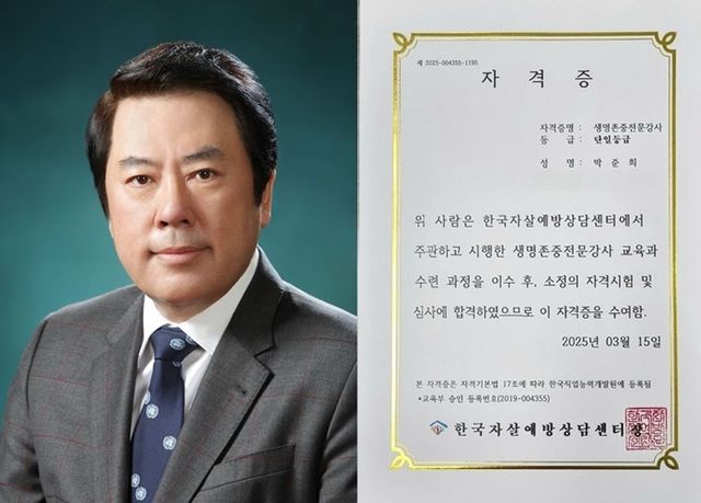 생명존중전문강사 자격증을 취득한 아이넷방송그룹 박준희 회장은 1명의 자살로 6명 이상의 가족 및 관계인들이 절망 속에서 삶을 포기하지 않도록 모두의 생명을 소중하게 보호하고, 희망찬 미래를 꿈꾸는 사회를 위해 생명 존중 문화 수립을 위한 인식개선과 홍보를 위해 2025년 3월 1일 칭찬대학 이사장으로 취임하여 우리 모두의 관심과 칭찬으로 희망찬 미래를 꿈꾸는 사회를 만들어 가고자 생명존중전문강사 자격증을 취득 하였다고 밝혔다.
