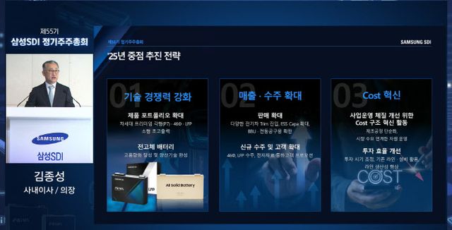 주총을 진행한 김종성 삼성SDI 경영지원실장(부사장)은 최근의 실적 부진 및 주가 하락을 먼저 거론했다. 김 부사장은 “기대에 부응하지 못한 실적과 주가하락으로 심려를 끼쳐드려 무거운 책임감을 느낀다”며 “주가 하락에는 여러 요인이 있겠지만 실적 부진 영향이 가장 컸고 미국 대선 후 친환경 정책 우려와 무역환경 변화의 불확실성도 부정적”이라고 언급했다.