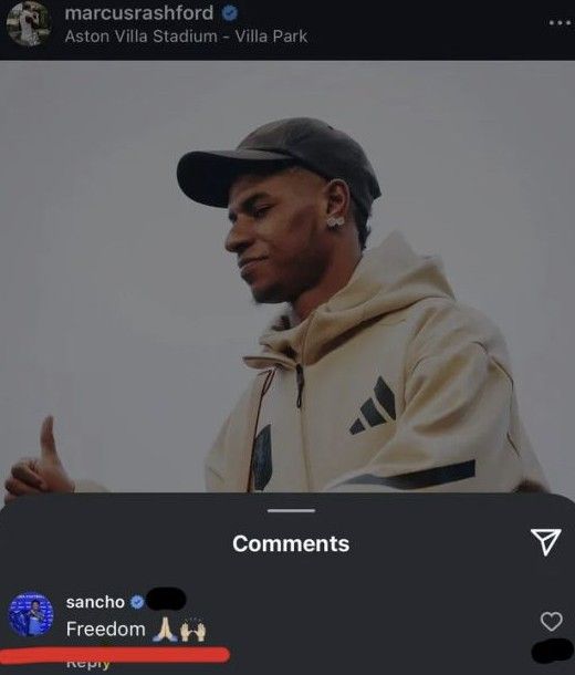 지난달 3일 맨유를 떠나 애스턴 빌라 임대 중인 마커스 래시포드가 경기 승리 후 자신의 SNS를 통해 승리 소감을 전했다. 여기에 산초는 '자유(Freedom)'라는 단어와 함께 두 손을 모은 이모지와 두 손을 활짝 펼친 이모지를 각각 하나씩 옆에 붙여 댓글을 남겼다.