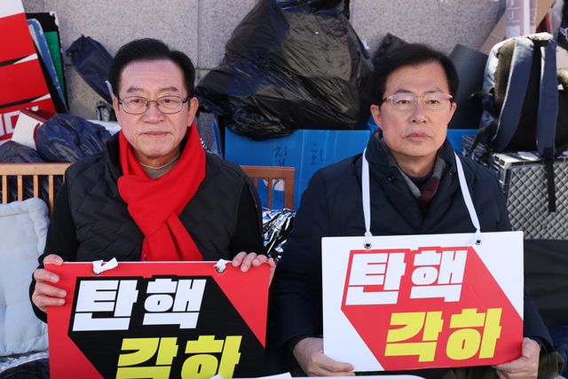 이종배(왼쪽), 이만희 국민의힘 의원이 19일 서울 종로구 헌법재판소 앞에서 윤석열 대통령의 탄핵 각하를 촉구하는 릴레이 시위를 하고 있다. ⓒ 연합뉴스