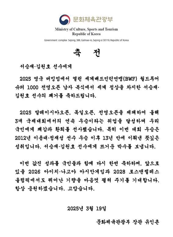 19일 문체부에 따르면 유인촌 장관은 축전을 보내 “세계 정상을 차지한 서승재·김원호 선수의 쾌거”라며 “2025 말레이시아오픈에 이어 독일오픈, 전영오픈을 제패해 올해 3개 국제대회에서의 연속 우승이라는 위업을 달성했다”고 축하했다.
