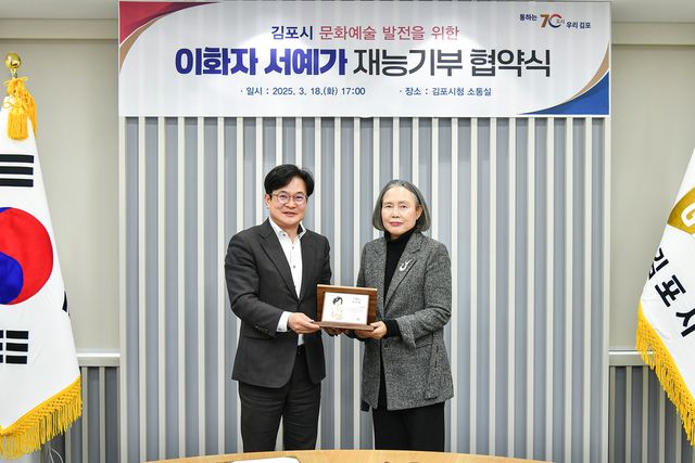 김포시(시장 김병수)가 18일 김포시청 소통실에서 서예가 이화자와 함께 도시 브랜드 가치 향상, 지역문화예술 활성화를 위한 재능기부 협약을 체결했다.