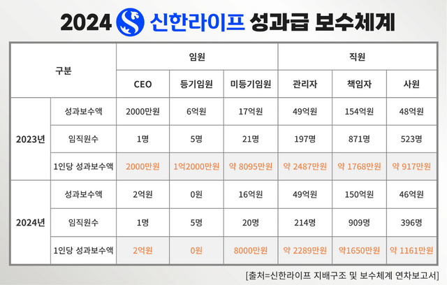 상황이 이렇다 보니 신한라이프 내부에서는 회사 성과보수 체계에 대한 불만의 목소리가 끊이지 않고 있다. 익명을 요구한 신한라이프의 한 직원은 "실적 향상에 가장 크게 기여하는 것은 현업에서 뛰는 임직원들 아니냐"라며 "실적이 올랐는데 오히려 성과급을 낮춰 회사 인건비를 줄이면 결국 모든 임직원들의 성과가 CEO 한 명의 성과로 둔갑하는 것과 뭐가 다른가"라고 목소리를 높였다.