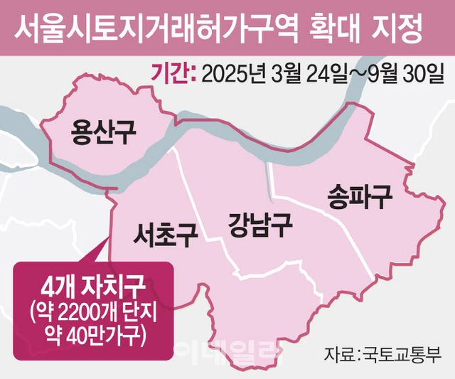 국토교통부·서울시 등 관계부처는 19일 서울정부청사에서 브리핑을 갖고 강남3구와 용산구 소재 전체 아파트 약 40만호를 토지거래허가구역으로 지정한다고 밝혔다. 오는 24일부터 9월 30일까지 6개월간 지정하고 필요시 기간을 연장키로 했다. 오는 24일 체결된 신규 매매계약부터 규제를 적용한다. 앞서 서울시가 잠삼대청(잠실·삼성·대치·청담)을 토지거래허가구역에서 해제한 지 34일 만이다.