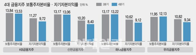 박혜진 대신증권 연구원은 “KB금융은 올 1분기 CET1비율이 13.7%로 회복할 것으로 예상한다”며 “보험사 인수와 비과세 배당 등을 추진하는 우리금융도 CET1비율 12.5%를 조기 달성할 것으로 본다”고 말했다.