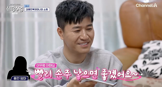 이날 전화 통화를 연결한 김종민 어머니는 손주는 누구 닮았으면 하는지 묻자 “반반 닮아야죠. 아무튼 하나 낳았으면 좋겠다”고 말했다.