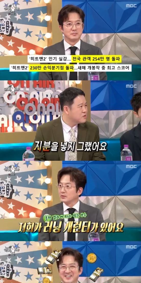 이날 방송에서 정준호는 관객들의 많은 사랑을 받은 영화 '히트맨2'를 언급하면서 "구정 때 개봉해서 관객수 250만명이 넘었다. 러닝 개런티가 있다. 손익분기점은 오래전에 넘었다. 그래서 계속 계산을 하고 있다"면서 행복해했다.