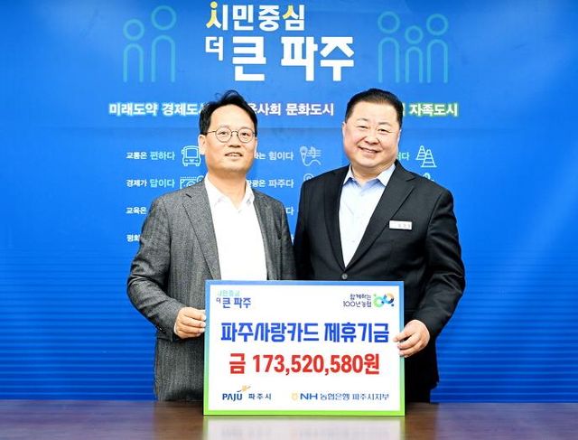 이학필 엔에이치(NH)농협은행 파주시지부장은 “제휴카드 적립기금이 지역발전에 보탬이 되길 바란다”라며 “앞으로도 농협은행은 다양한 협력을 통해 지역사회에 봉사하는 금융기관이 되겠다”라고 말했다.