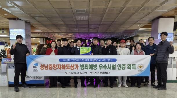[와이뉴스] 성남도시개발공사 상가관리처는 성남중앙지하도상가가 분당경찰서로부터 ‘범죄예방 우수시설’ 인증을 획득했다고 20일 밝혔다.
