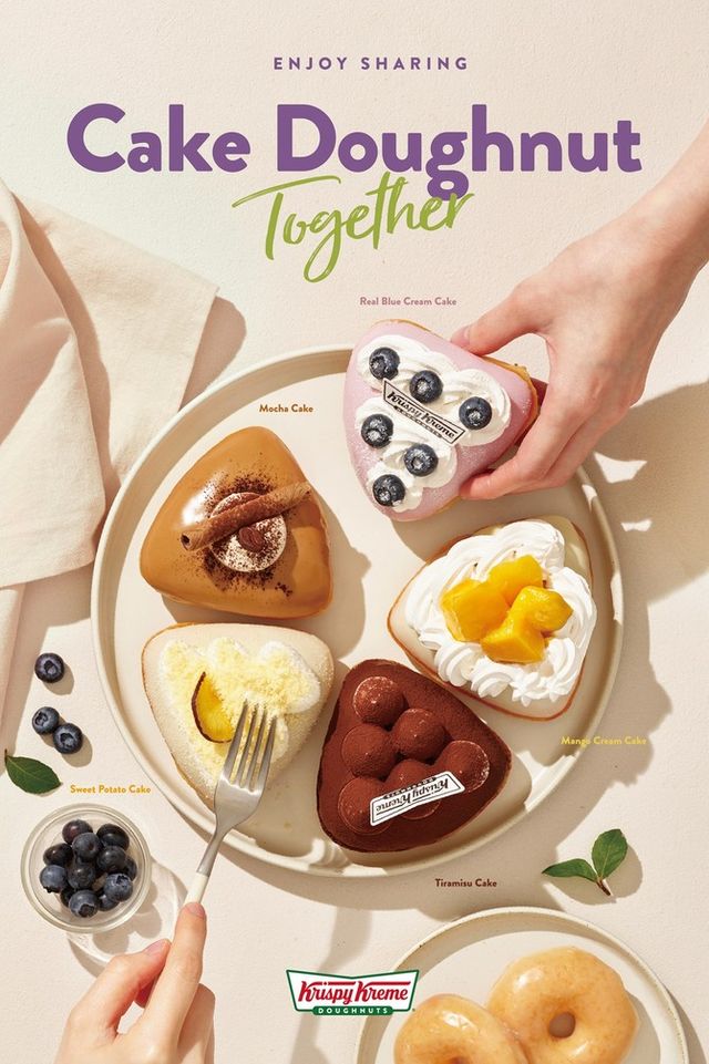 모든 도넛은 조각 케이크 모양의 삼각형 도넛으로 제작했다. 블루베리 맛의 상큼한 △리얼블루생크림케이크, 우유크림과 달콤한 망고의 조화가 일품인 △망고 생크림 케이크, 달달 고소한 고구마 맛의 △고구마 케이크, 크림치즈 필링을 듬뿍 넣은 △티라미수, 커피 한 잔을 떠올리게 하는 △모카 케이크 총 5종이다.