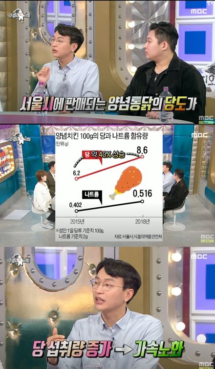 이어서 "1960년대~1970년에는 당분을 거의 안 먹는다. 그러다가 2015년 정도에 (한국인의) 당 섭취량이 확 늘어났다", "양념통닭의 당도가 4년 동안 40% 정도가 상승했다"고 말했다. 당 섭취량의 증가는 가속 노화를 이끈다고 말해 모두를 놀라게 했다.