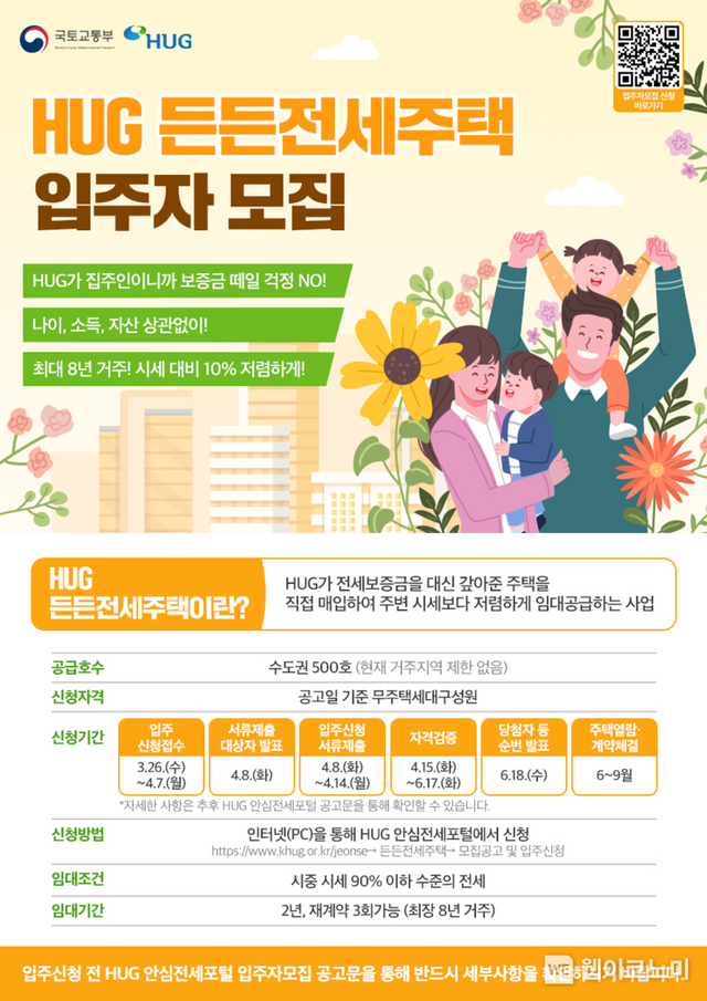주택도시보증공사(사장 유병태, 이하 ‘HUG’)는 오는 26일부터 총 500호 규모의 제6차 든든전세주택 입주자 모집공고를 실시한다고 20일 밝혔다.