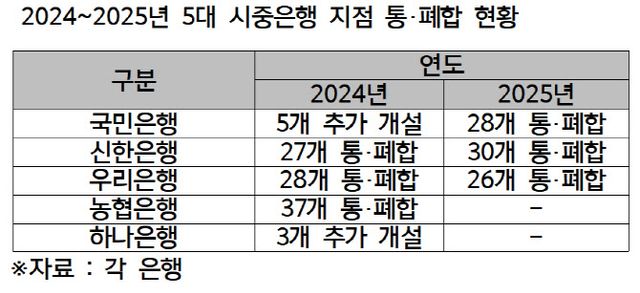 5대 시중은행의 2024년 통폐합 점포 수는 농협은행이 37개(1100개→1063개)로 가장 많았고, 신한은행 28개(721개→693개), 우리은행 27개(711개→684개) 등이었다. 하나은행 5개(597개→602개)과 국민은행 3개(797개→800개) 등은 점포를 일부 늘렸지만, 올 들어 국민은행은 이달 10일 27개, 4월 1일 1개 등 28개 지점을 통폐합한다.