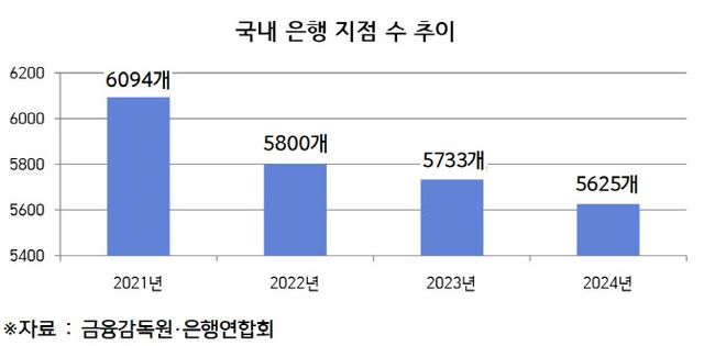 금융감독원·은행연합회 등에 따르면 최근 5년간 국내 은행 지점·출장소 수(연말 기준)는 2020년 6405개, 2021년 6094개, 2022년 5800개, 2023년 5733개, 2024년 5625개 등으로 지속적으로 감소하고 있다. 코로나19 엔데믹 이후 금융위원회가 은행 점포 폐쇄 내실화 방안을 내놓았던 2023년엔 통폐합 점포 수가 한해 67개로 두자릿수로 감소세가 주춤했지만, 2024년엔 108개로 다시 늘며 가속도가 붙는 모양새다.