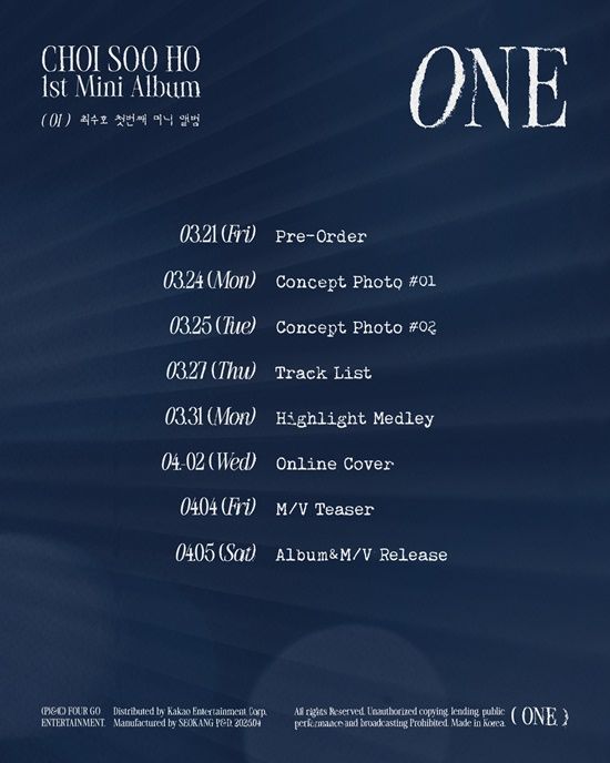 소속사 포고엔터테인먼트는 20일 11시 공식 SNS를 통해 최수호의 첫 번째 미니 앨범 '원(ONE)' 스케줄러를 공개하고 발매 소식을 알렸다.