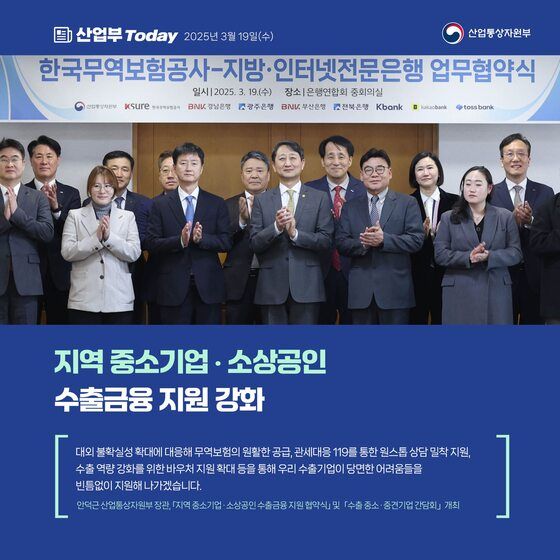 산업통상자원부는 안덕근 장관이 지난 19일 '지역 중소기업·소상공인 수출금융 지원 협약식' 및 수출 중소·중견기업 간담회를 개최했다고 전했다.