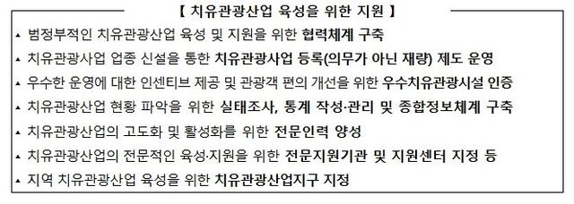 정부는 그간 국정과제로 ‘여행으로 행복한 국민, 관광으로 발전하는 대한민국(61번)’을 선정, 국민의 여행 기회 확대와 관광을 통한 지역 경제 활성화 등을 위해 노력하고, 관련 법 제정에도 힘써왔다. 특히, 이번 「치유관광산업법」은 국민의힘 배현진 의원과 더불어민주당 김윤덕 의원이 발의한 관련 법안이 통합·제정된 법으로서 치유관광산업 육성을 위해 정부와 국회가 함께 노력한 결과물이라는 점에서 더욱 큰 의미가 있다.