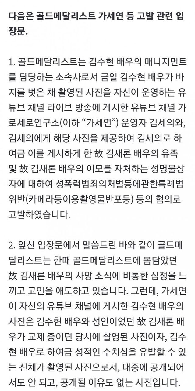 김수현은 고인의 장례식장도 찾지 않았습니다. 사귀었던 전 연인의 마지막 길인데다, 소속사 영입 1호 연예인의 장례식장인데도 가지 않았습니다. 그 때만 해도 둘의 교제 사실이 폭로된 것도 아니었는데도 말이죠. 그저 골드메달리스트 명의로 “김새론 씨의 안타까운 소식을 접하고 깊은 애도를 표합니다. 삼가 고인의 명복을 빕니다”고 밝혔을 뿐입니다.