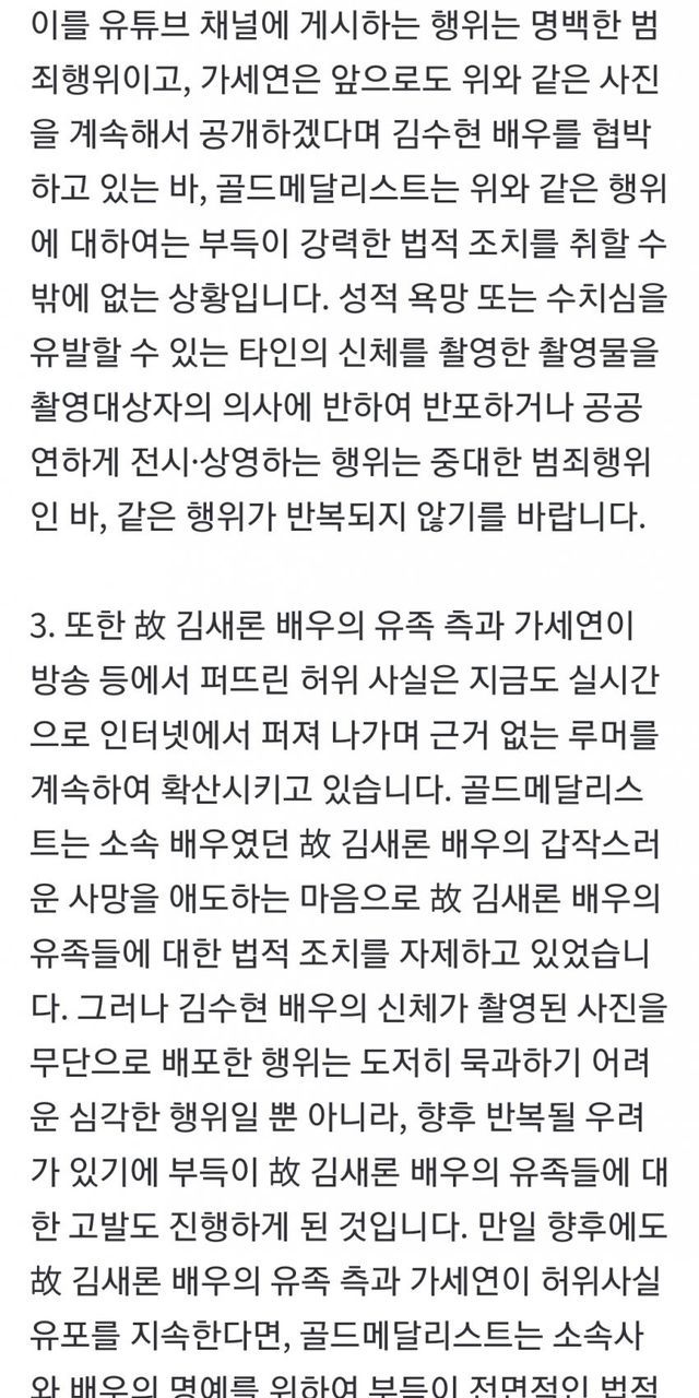 그러면서 소속사 측은 “맥락이 제거되고 사실이 왜곡된 근거 하나로 누군가를 죄인으로 만들고, 죄인이기 때문에 모든 것이 단죄의 대상이 됩니다. 가세연의 보도 이후 김수현씨는 과거의 모든 행적이 마치 의도된 악행처럼 해석됩니다. 타인의 사생활을 무단으로 유출한 자극적인 이미지와 함께 김수현씨가 당시 16세의 김새론씨를 사귀었다는 주장이 반복됩니다. 이 과정에서 허위사실이 기정사실처럼 바뀌고, 인터넷을 통해 확산되며 셀 수 없이 많은 가짜 뉴스가 파생되도록 만듭니다. 단죄의 대상이 된 당사자가 이 모든 것들을 일일이 반박하는 것은 불가능에 가깝고, 한다 해도 수많은 근거와 자료를 정리하기 위해 막대한 시간과 노력을 들여야 합니다. 그 사이 당사자는 회복하기 어려운 피해를 입습니다”고 밝혔습니다.