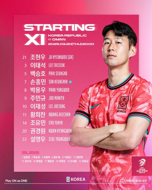 축구 대표팀이 4개월 만에 다시 뛴다. 손흥민(토트넘)·황희찬(울버햄프턴)·백승호(버밍엄시티) 등이 오만과의 2026 국제축구연맹(FIFA) 북중미 월드컵 아시아 3차 예선 B조 7차전에서 선발 출격한다. 이강인(파리 생제르맹)이 벤치에서 출격을 기다리고, 부상 이슈가 있던 황인범(페예노르트)은 아예 명단에서 제외됐다.