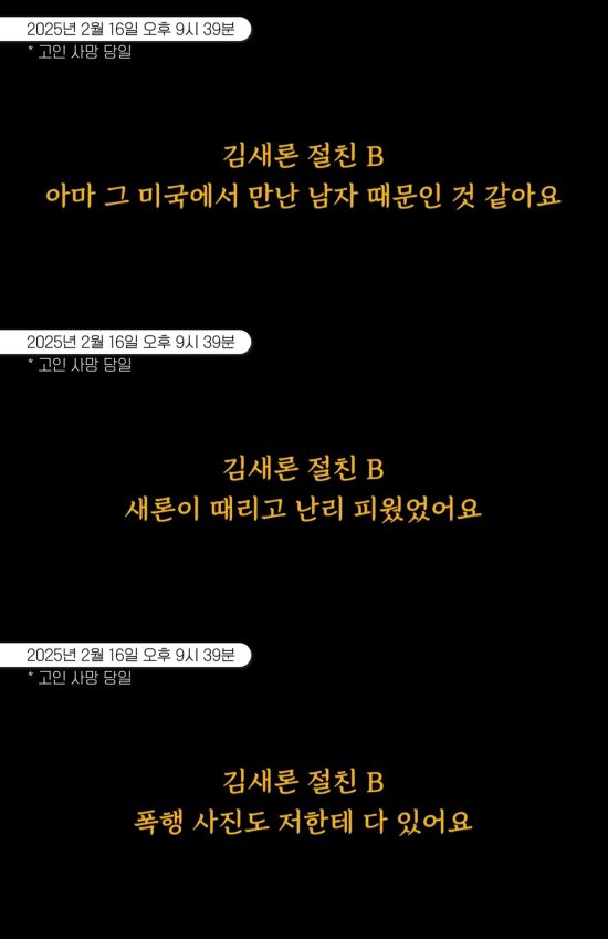 영상 속 고 김새론의 친구는 "(김새론과) 그저께까지 만났다. 괜찮았다. 같이 스크린골프도 치고 밥도 먹었다"며 "아마 그 미국에서 만난 남자 때문인 것 같다. 걔가 새론이 때리고 난리 피웠다. 폭행한 사진도 저한테 다 있다"고 김새론의 새 소속사 매니저에게 이야기했다.