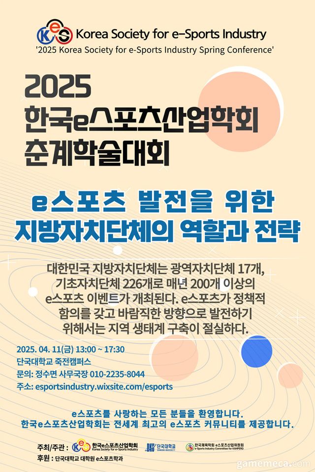 한국e스포츠산업학회는 4월 11일 단국대학교 죽전캠퍼스에서 2025 한국e스포츠산업학회 춘계학술대회를 개최한다.