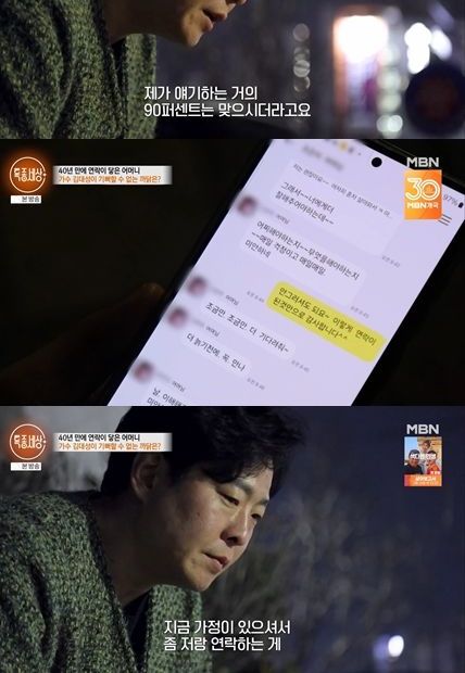 전화통화를 하고 나서 이후로는 어머니와는 문자만 주고 받았다는 김대성은 "지금 가정이 있으셔서 저랑 연락하는 게 껄끄러우신 것 같다. 지금 상황이 그렇다"며 씁쓸해했다.